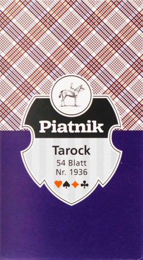 Najwyższej jakości karty do taroka. Talia 54 fakturowanych kart o wymiarach 6,3 x 11,3 cm z tradycyjnymi awersami i koszulkami typu "Karo".