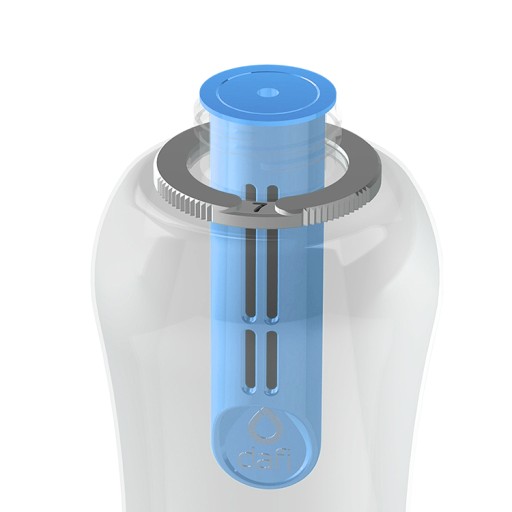 Butelka wielokrotnego użytku DAFI Soft została wyposażona w wymienny filtr węglowy, który należy zmieniać co miesiąc. Filtr wykonany jest z naturalnego medium, pozyskiwanego z łupin orzecha kokosowego. Usuwa on nieprzyjemny smak i zapach chloru z wody kranowej, zachowując jednocześnie niezmienioną ilość naturalnych minerałów, głównie wapnia i magnezu, które są cenne dla zdrowia.