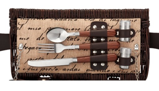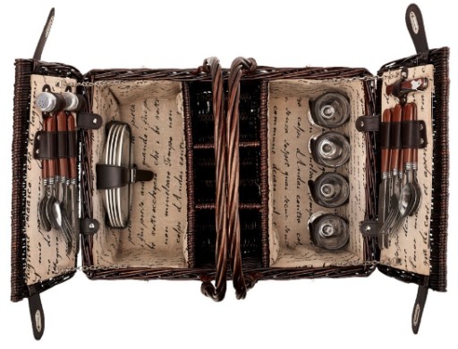 Ten pleciony kosz marki Kayoba jest wyściełany ładną, materiałową podszewką oraz wypełniony wszystkim, co może przydać się na pikniku. Kosz zawiera cztery kieliszki, cztery talerze, cztery noże, cztery widelce i cztery łyżki. Wewnątrz znajduje się też pieprzniczka i solniczka oraz scyzoryk z korkociągiem i otwieraczem do butelek. W koszu są także trzy komory na butelki. Krótko mówiąc – wszystko, czego potrzebujesz, oprócz jedzenia i picia!
