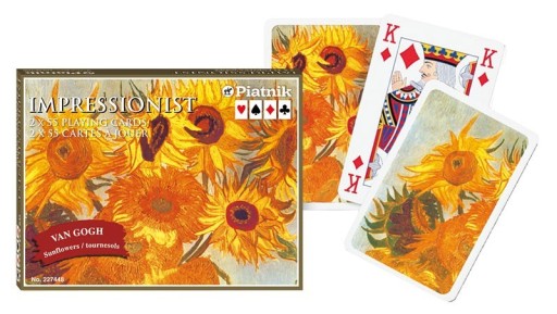 W komplecie 2 talie w eleganckim, złoconym pudełku z charakterystyczną Piatnikowską poduszeczką, a całość w oprawie "Słoneczników" Vincenta van Gogha. Talie składają się z 55 plastikowanych kart o wymiarach 58 x 89 mm i gramaturze 310. Idealne zarówno do brydża, pokera, remika jak i innych gier.