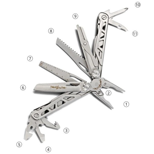 Multitool to śrubokręty z dołączonymi do zestawu bitami, nóż, nożyczki, brzeszczot do drewna, otwieracz do puszek i butelek, kombinerki, szczypce igłowe, przecinacz do kabli oraz do pasów samochodowych, linijka i wiele, wiele innych akcesoriów wykonanych z największą starannością z nierdzewnej stali hartowanej.