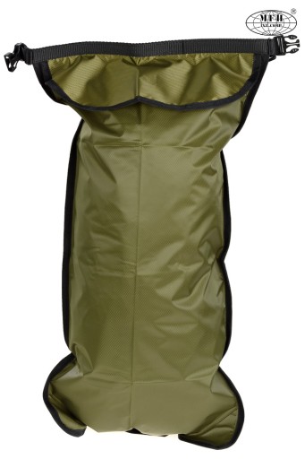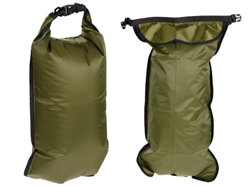 Survivalowy / turystyczny wór transportowy o specyfikacji militarnej. Całkowicie wodoszczelny, skutecznie uchroni bagaż przed zamoknięciem. Idealny na raftingu, podczas przeprawy wodnej, na spływie kajakowym, rejsie łodzią lub na rybach. Nawet po załadowaniu nie tonie. Wykonany z bardzo wytrzymałego, dodatkowo wzmacnianego siatką Rip-Stop, podgumowanego materiału. Proste i nadzwyczaj pewne zamknięcie wzbogacone o lateksowe uszczelki. Usztywniana taśma zamykająca wyposażona w klamrę z tworzywa - spełnia rolę uchwytu do przenoszenia, D-ring - umożliwia przywiązanie worka np. do pontonu. Doskonały także jako zbiornik na wodę lub po zamknięciu z powietrzem w środku jako bojka ratunkowa.