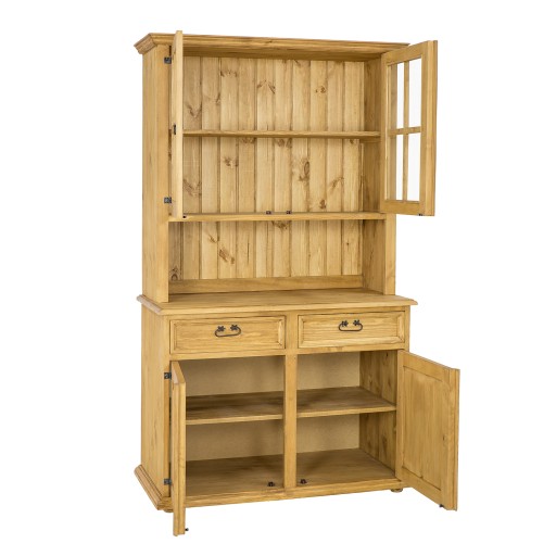 Rustykalny Kredens wykończony naturalnym woskiem na bazie wosku pszczelego, w całości wykonana z litego drewna sosnowego. Plecy wykonane są z sosnowej boazerii, spody szuflad z sosnowej sklejki. Ręcznie produkowane oraz specjalnie postarzane okucia meblowe nadają jaj lat.