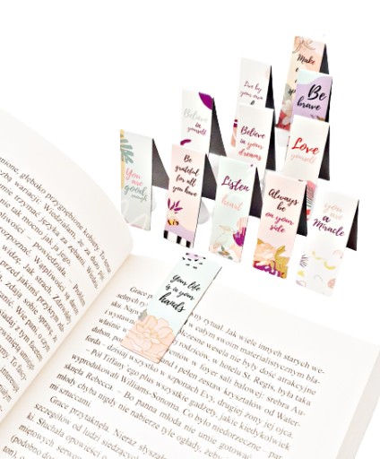 Każda zakładka, to nie jedynie zwykła zakładka. To przypomnienie o tym, co ważne. Na zakładkach znajdziesz ważne dla Ciebie lub dla osoby, którą chcesz nimi obdarować sentencję, taką jak np.: jesteś cudem, żyj z całych sił, czy uwierz w siłę swoich marzeń. Reszta niech pozostanie niespodzianką.