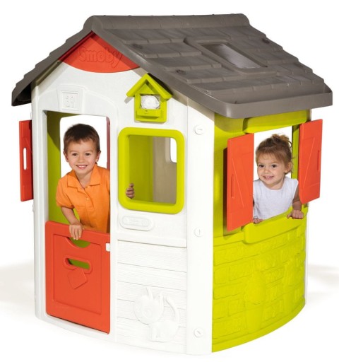 - Posiada dwa okna z okiennicami w ściankach bocznych, niskie drzwiczki do połowy wejścia, a także takie samo okienko z przodu domku, obok drzwi wejściowych.