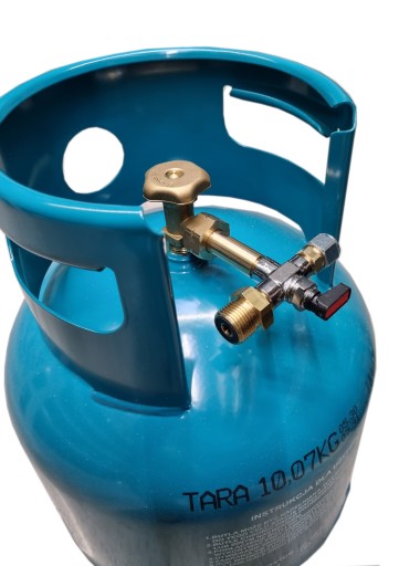 Zestaw zawiera zawór kulowy trójdrożny. Przy tankowaniu butli otwieramy przelot z zaworu tankującego do butli (wyjście na instalacje jest zamknięte). Po zatankowaniu kurek zaworu przekręcamy o 180 stopni. Otwieramy w ten sposób drogę gazu z butli do instalacji, a zamykamy powrót gazu z butli w kierunku wlewu.