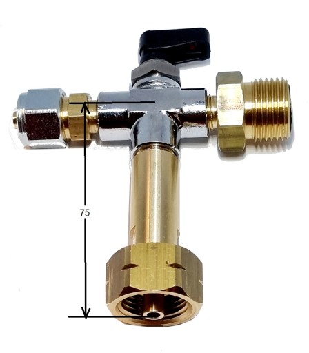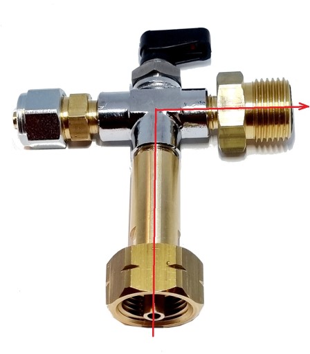 Zawór kulowy trójdrożny z gwintem W21,8x1/14"L (lewy gwint - taki jak na butli gazowej 11 kg) z jednej strony, z drugiej nakrętka W21,8x1/14"L (taka jaką nakręca się na zawór butli) , z trzeciej złącze na wąż PCV do gazu 8 mm