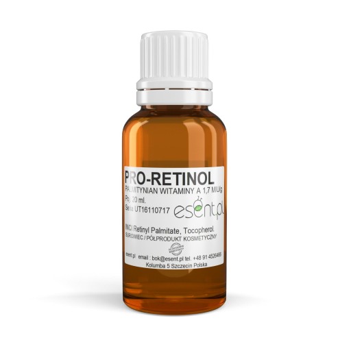 Palmitynian retinylu (PRO-RETINOL) - jest najdelikatniej działająca forma witaminy A stosowaną w kosmetyce. Dzięki postaci estrowej możliwe jest stosowanie witaminy A nawet przy bardzo wrażliwych cerach. Pro - retinol pod wpływem enzymów obecnych w skórze przekształca się w retinol - podstawową formę witaminy A.