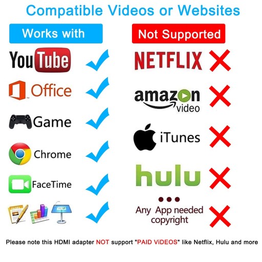 7. Nie jest kompatybilny z HDCP. Kabel nie może odtwarzać niektórych zaszyfrowanych filmów z Netflix i iTunes Store. Ale może grać w YouTube. Proszę sprawdzić załączone zdjęcia .