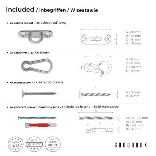 1. W zestawie wraz z huśtawką znajduje się hak montażowy do powierzchni drewnianej lub betonowej. Hak wykonany jest z wysokiej jakości stali nierdzewnej.