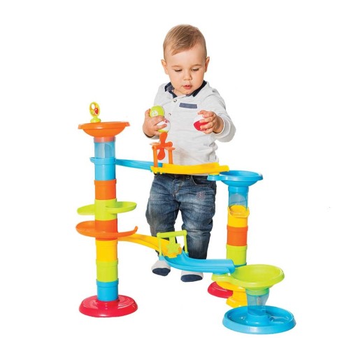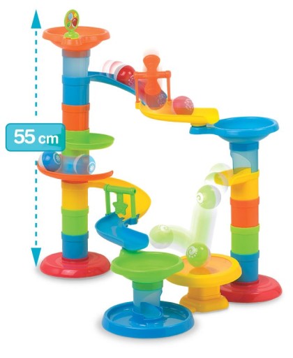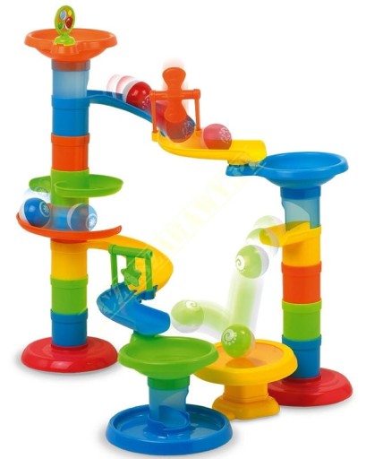 - Zbuduj wielką zjeżdżalnię z dwoma torami wyposażonymi w obrotowe elementy oraz trampolinę podrzucającą spadające piłeczki.