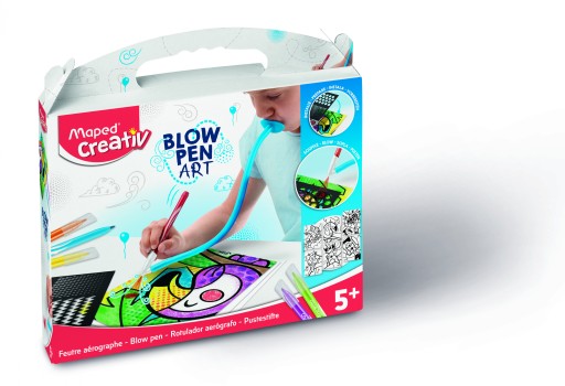 Nietypowy sposób na kolorowanie - umieść flamaster w plastikowej nasadce z elastyczną rurką i dmuchaj w ustnik a kolorowa mgiełka osiądzie na kartce dając ciekawy efekt. W ogóle się nie zmęczysz - dzięki rurce nie musisz się schylać nad swoim arcydziełem. Wykorzystaj szablony i zostań młodym Grafficiarzem.