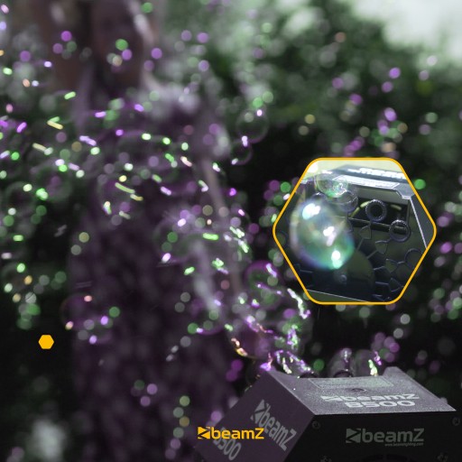 Urządzenie posiada obrotowe koło oraz cichy wentylator, dzięki którym ze specjalnego płynu wytwarzane są bańki mydlane.
