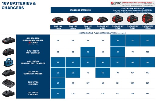 - Czas ładowania ProCORE18V 12,0 Ah (80%/100%) ok. 162/172 min