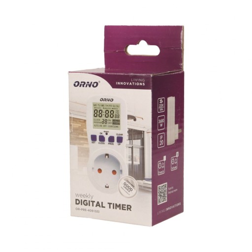 Programator czasowy elektroniczny OR-PRE-409(GS) marki ORNO wyposażony został w duży wyświetlacz LCD i służy do ustawiania czasu włączania i wyłączania urządzeń elektrycznych takich jak: oświetlenie, ogrzewacze wody, reklamy itp. Prezentowany model urządzenia wyposażony został w 16 programów czasowych , 16 kombinacji dnia tygodnia, funkcję czasu letniego oraz zimowego, funkcję odliczaniacount down . Do produktu można podłączyć urządzenie o maksymalnym obciążeniu do 3680W . Produkt wyposażony jest w 1 gniazdo typu F - standard schuko - bolec uziemiający na dole!