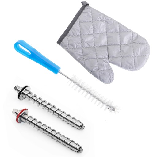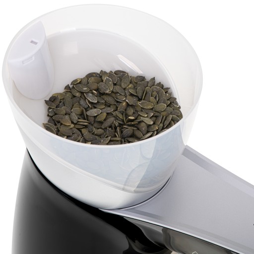 Pojemnik pomieści około 700 gram nasion. W zestawie znaleźć można ślimak prasy na duże i na mniejsze nasiona, co pozwala używać większość roślin oleistych i orzechów. Dodatkowo w zestawie otrzymujemy rękawicę termiczną, szczotkę do czyszczenia i filtr do oleju. W urządzeniu znajduje się osobny zbiornik na olej i zbiornik na wytłoczyny, co eliminuje problem bałaganu na kuchennym blacie podczas tłoczenia. Zabezpieczenie przed przegrzaniem oraz wyłącznik bezpieczeństwa przy otwarciu pokrywy sprawiają, że jest to produkt bezpieczny w użyciu.