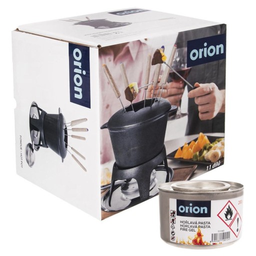 Zestaw do fondue solidnie wykonany. W zestawie: 1x kociołek, 1x stojak, 1x palnik, 6x widelczyki, 1x stalowa podstawa, 1x pasta łatwopalna. Garnek jest wykonany z żeliwa, więc należy po każdym użyciu nasmarować go olejem jadalnym, aby uniknąć pojawienia się rdzy. 80gr żelu spala się w 90 min. Zestaw nie nadaje się do mycia w zmywarce. Oryginalny produkt czeskiej marki Orion. Wyprodukowano zgodnie z europejskimi standardami.