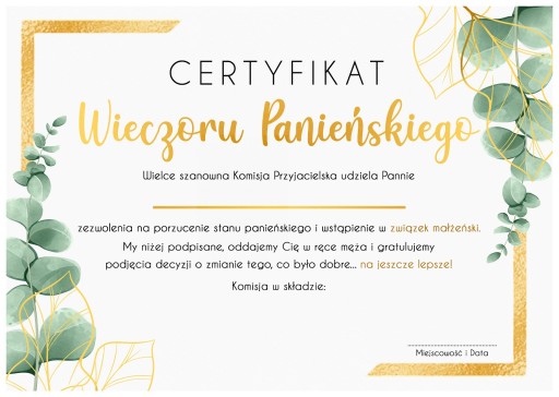 - Elegancki certyfikat na wieczór panieński. Idealnie wpasuje się do imprezy zarówno w stylu boho jak i glamour;