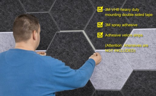 - Łatwy w instalacji: w normalnych warunkach zarówno klej w sprayu, jak i taśma dwustronna (nie są dołączone). Wystarczy przykleić go z tyłu płyty akustycznej, a następnie zamocować w odpowiedniej pozycji.