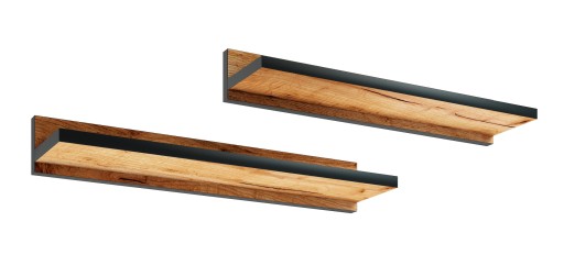 Zestaw 2 półek wiszących dąb 60 cm z listwą przyścienną (2 sztuki) oraz czarnym wykończeniem.