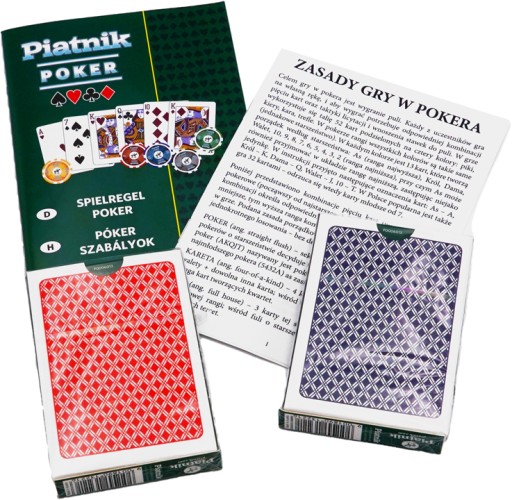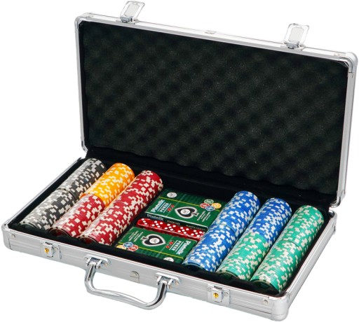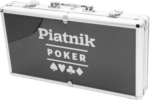 Zestaw 300 żetonów w aluminiowej walizce. Żetony z nominałami, waga po 14g, na każdym logo Piatnika. W komplecie ponadto: 2 talie 55 plastikowanych kart o pokerowym wymiarze 63 x 88 mm, 5 kości, żeton dla rozdającego i kluczyki do walizki. Dołączona instrukcja w języku polskim.