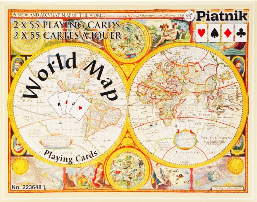 Bardzo popularne karty do gry Piatnika. Na pudełku i rewersach antyczna mapa świata. Dla podróżników i nie tylko.