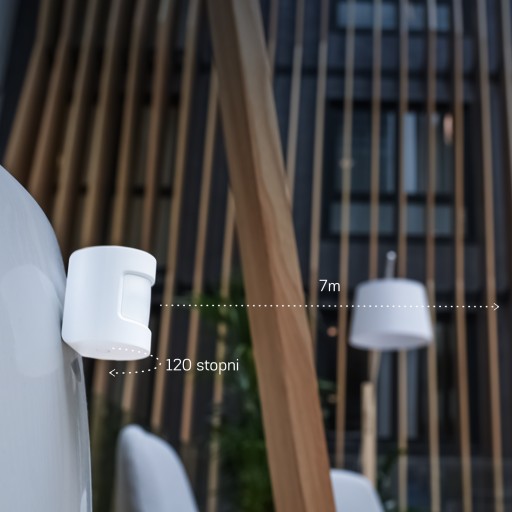 Czujnik pracuje w zakresie podczerwieni pasywnej PIR. Umożliwia wykrywanie ruchu przemieszczających się osób i większych zwierząt w zasięgu do do 8 metrów i kącie detekcji 120°.