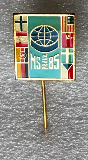 Odznaka z Mistrzostw Świata i Europy ( wtedy to był jeden turniej) w hokeju na lodzie. Czechosłowacja ( Praga ) 1985. Epoksyd, szpilka.