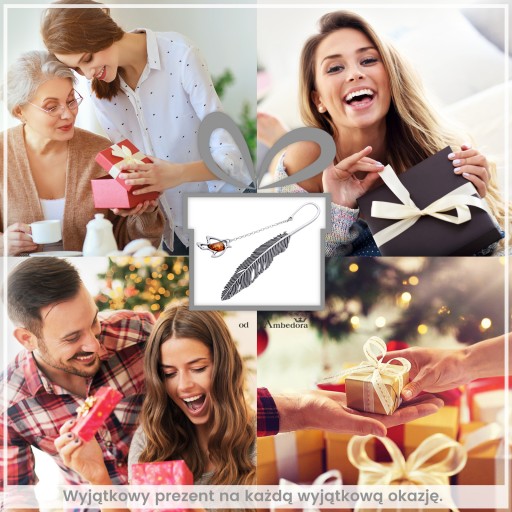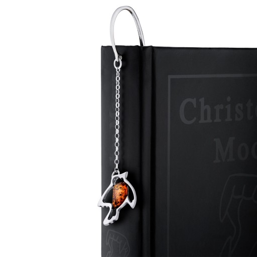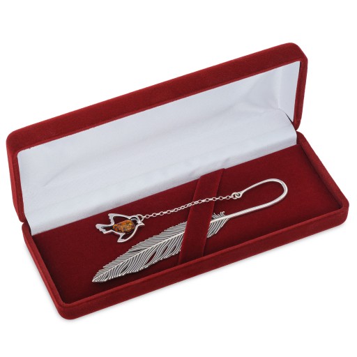 Srebrna zakładka do książki w kształcie ptasiego pióra z Ptaszkiem zawieszonym na łańcuszku o długości 4,8 cm. W ażurowy kontur ptaszka wprawiony jest naturalny bursztyn bałtycki w kolorze koniakowym. Do każdego naszego wyrobu dołączamy certyfikat autentyczności bursztynu.