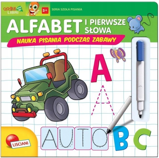 Książeczka z serii "Szkoła Pisania" pomaga dzieciom w stawianiu pierwszych kroków w nauce alfabetu oraz pisania pierwszych słów. Dzieci podpisują obrazki zmazywalnym pisakiem oraz zapisują ich pierwsze litery.