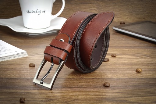 Tradycyjny, klasyczny pasek o uniwersalnej szerokości 3 cm .Ten model posiada srebrną klasyczną klamrę, która w połączeniu z brązową skórą tworzy nowoczesny i charakterny dodatek męski Wycięty został z jednego płatu naturalnej skóry - warstwy mizdrowej, która charakteryzuje się wysoką jakością w półce skór naturalnych. Dużym atutem użytej skóry jest jej zabezpieczenie warstwą lakieru od strony wewnętrznej co ma na celu zabezpiecza odzieży.