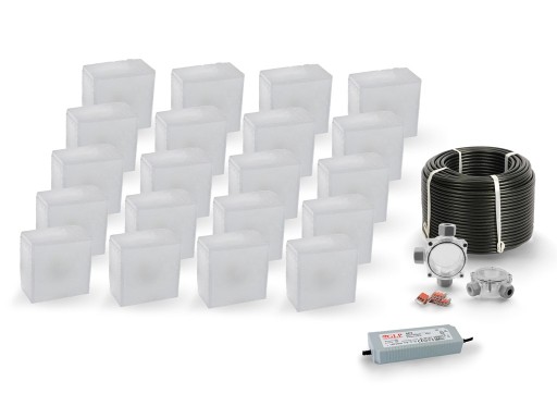 Nasza oferta obejmuje również niezbędne akcesoria instalacyjne takie jak: dedykowane przewody instalacyjne (4 żyłowe do kostek RGB i 2 żyłowe do kostek białych) do układania w ziemi, puszki hermetyczne do wykonywania rozgałęzień i połączeń w ziemi.