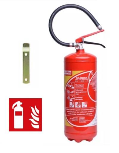 W skład zestawu wchodzi gaśnica proszkowa 6kg wieszak, znak.