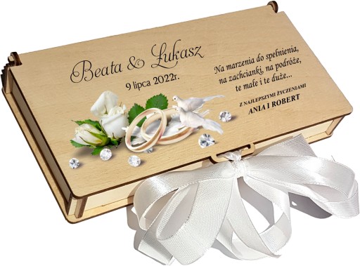 Do pudełka dołączamy 6 szt. obręczy na pieniądze, białą wstążkę, która doda delikatnego wykończenia, oraz wełnę drzewną do wypełnienia wnętrza pudełka, aby Twój prezent prezentował się wyjątkowo.