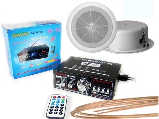 Zestaw ten świetnie nadaje się do instalacji audio w domach, salonach, poczekalniach, łazienkach itp. Wzmacniacz może służyć jako amplituner dzięki wbudowanemu tunerowi radiowemu wraz z teleskopową anteną.
