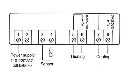 Obciążalność styków przekaźnika: Chłodzenie (10A/250VAC), Grzanie (10A/250VAC)