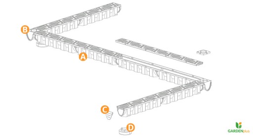 Można również dokupić króciec(D), który umożliwia zamontowanie pionowego odpływu do kanału.