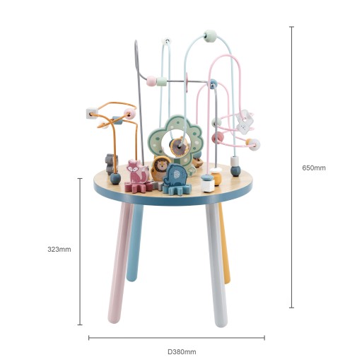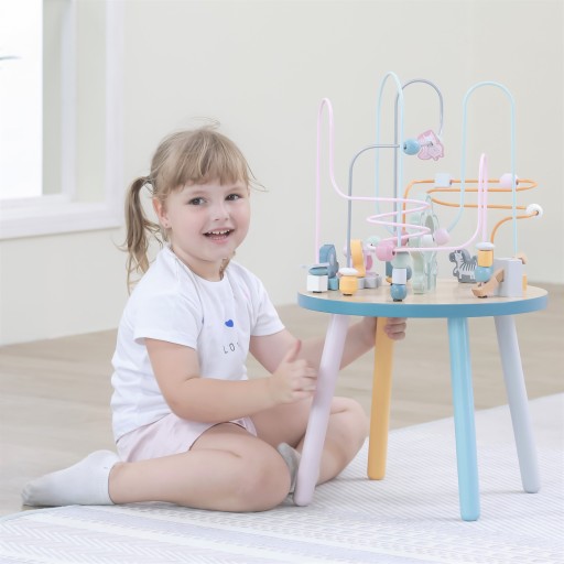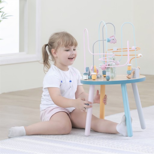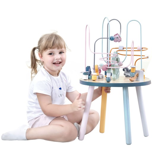 - Drewniany stolik edukacyjny zapewni maluchom mnóstwo radości, a w trakcie zabawy dzieci będą ćwiczyły zdolności manualne oraz postrzeganie kolorów i kształtów.