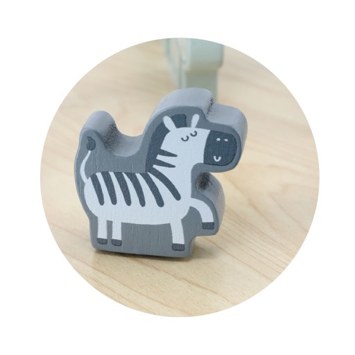 - Na metalowych pętlach umieszczone są drewniane, kolorowe klocki oraz trzy klocki z wizerunkiem zwierzaków – misia, lisa i jeża. Maluch może przemieszczać klocki w dowolny sposób ćwicząc przy tym precyzję ruchów paluszków i dłoni.