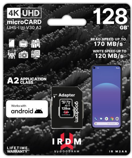 IRDM UHS-I U3 A2 microCARD zapewnia wysoką wydajność i niezawodność tym, którzy chcą nagrywać filmy w rozdzielczości 4K i slow motion lub zapisywać wysokiej jakości zdjęcia w formacie JPEG i RAW w trybach szybkiej reakcji. Karta jest kompatybilna z systemem Android*, dzięki czemu może służyć jako pamięć wewnętrzna urządzeń mobilnych, umożliwiając płynne nagrywanie multimediów oraz instalowanie aplikacji.