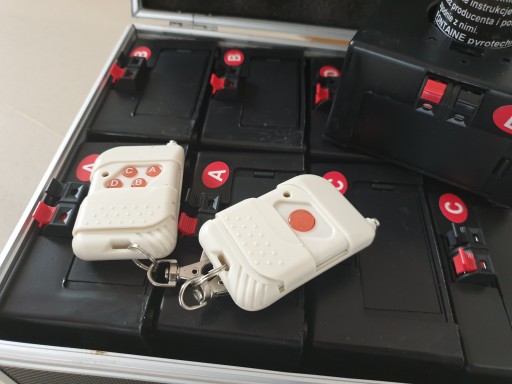 Zestaw do opalania pirotechniki a dokładnie fontann scenicznych które posiadamy także w sprzedaży. Zestaw posiada 8 stacji które są odpalane zdalnie 2 pilotami w różnych konfiguracjach. Każda stacja jest zasilana 2 bateriami AA które wystarczają na parę lub kilkanaście pokazów a przy dobrym gospodarowaniu na cały sezon. Udzielamy rocznej gwarancji ( polskiej gwarancji), gwarantujemy wsparcie techniczne i pełną informację o czym przekonali sięniejednokrotnie nasi zadowoleni klienci. Kupując nasze stacje które pracują na bezpiecznym paśmie 433MHz masz pewność że żadna dymiarka czy też inne urządzenie nie odpali zestawu. Cena zestawu 680 zł. Posiadamy również w sprzedaży bardzo dobre fontanny-wkłady do zestawów, które nie wydzielają przykrych zapachów.