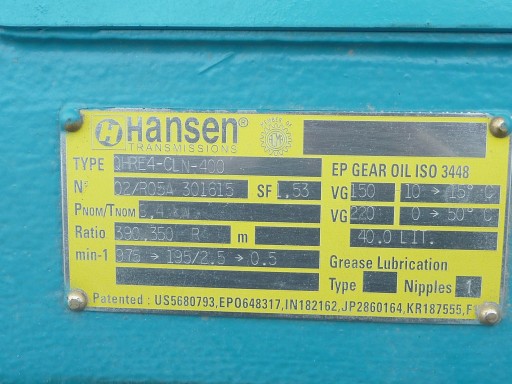 W tym ogłoszeniu mam zaoferowania nieużywaną przekładnię , motoreduktor firmy HANSEN o przełożeniu i=390,35 . Do przekładni można zamocować silniki o różnych mocach i obrotach. Zamek w kołnierzu mocującym ma średnicę 250mm. Można stosować silniki o wielkości mechanicznej 160 lub 180. Możemy założyć silniki np: 11kW na 960obr/min, 7,5kW na 960obr/min, 7,5kW na 720obr/min, 5,5kW na 720obr/min. Przy silniku na 960obr/min na wyjściu będzie 2,5obr/min. Przy silniku na 720obr/min na wyjściu będzie 1,8obr/min. Na wejściu do przekładni można również założyć motoreduktor kołnierzowy o jeszcze mniejszych obrotach np 400 lub 200 obr/min. Zakres obrotów wejściowych 975-195 obr/min, zakres obrotów wyjściowych 2,5-05 obr/min. Oś wejściowa 34mm, oś wyjściowa 135mm. Waga 870kg. Przekładnia wyposażona jest w pompę olejową która tłoczy olej do łożysk poprzez specjalne kanały. To rozwiązanie zastosowane jest ponieważ przy tak niskich obrotach przekładni nie następuje klasyczny rozbryzg, rozrzut oleju i smarowanie łożysk jest wymuszone pomp olejową. (teoretycznie gdyby zalać olejem przekładnię do połowy to pompa smarująca nie była by potrzebna, ponieważ wszystkie łożyska były by zanurzone).