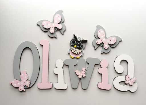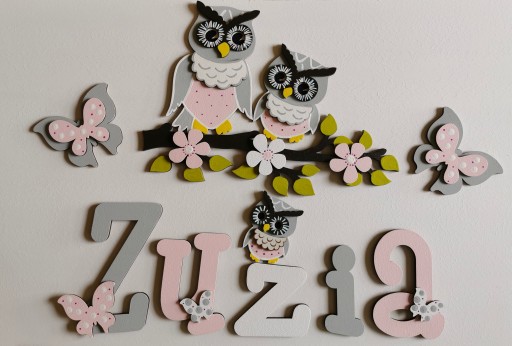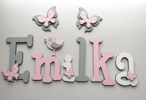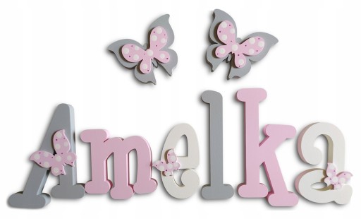Do każdego zakupionego imienia otrzymujesz dwa duże 10 cm dekory nad napis oraz kilka małych dekorów naklejonych na literkach tak jak w poniższych naszych realizacjach w galerii.