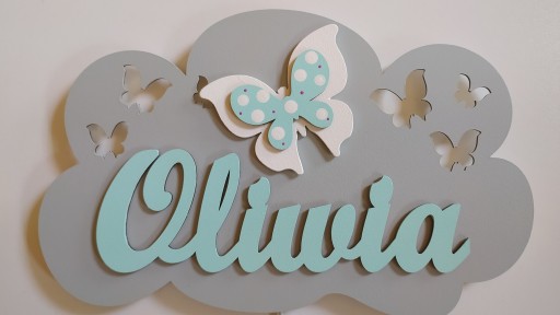 Chmurka posiada wycięte elementy ażurowe w postaci gwiazdek oraz motyli. Dodatkowo na każdej chmurze umieszczamy napis z imieniem twojego dziecka i jeden dekor 10 cm do wyboru: motyl, sowa, miś.