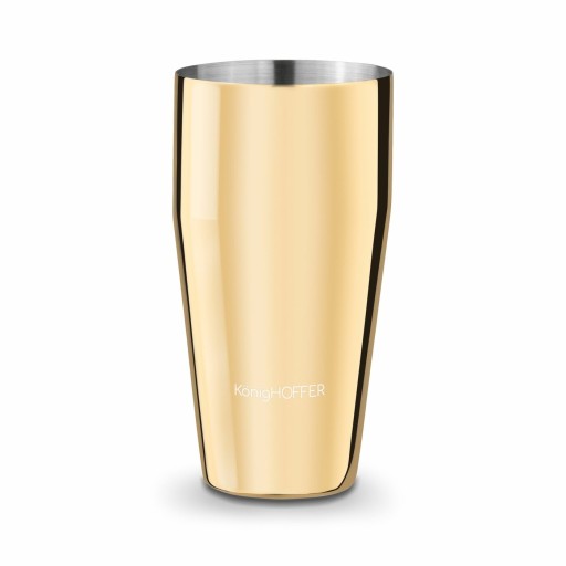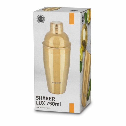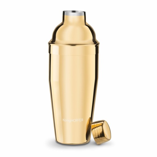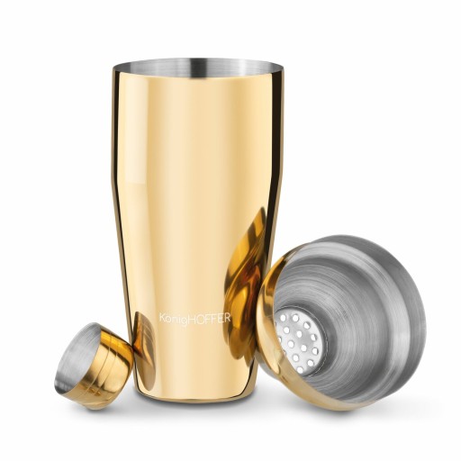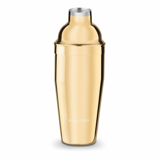 Shaker Konighoffer Lux 750 ml jest nierdzewny i malowany na złoto. Jego powierzchnia ma błyszczące wykończenie. Produkt ten składa się z trzech części – pojemnika o ergonomicznym kształcie, pokrywki zapewniającej szczelność shakera i sitka. Funkcjonalność i jakość wykonania stoją na poziomie modeli używanych przez barmanów. Shaker ze stali szlachetnej przyda się na każdym przyjęciu lub podczas relaksującego wieczoru ze znajomymi. Atrakcyjna pojemność pozwoli ci na oszczędność czasu podczas przygotowywania wielu drinków i fantazyjnych napojów na każdą porę roku.