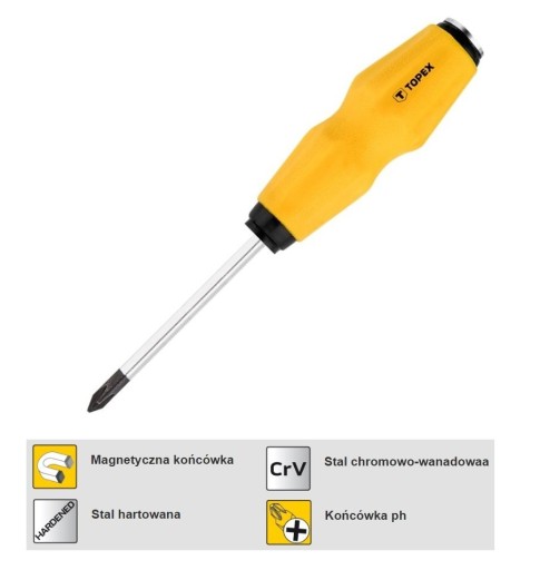 ✅ Wkrętak krzyżowy do pobijania TOPEX (nr ref. 39D263) przeznaczony do dokręcania i wykręcania zapieczonych, mocno dokręconych śrub. Grot o długości 150 mm wykonany z wytrzymałej stali chromowo-wanadowej, zapewniającej długą żywotność narzędzia. Magnetyczna końcówka PH2 z hartowanej stali ułatwia pracę narzędziem. Ergonomiczny uchwyt z tworzywa sztucznego dobrze leży w dłoni, co podnosi komfort pracy. Marka TOPEX skierowana jest do majsterkowiczów.