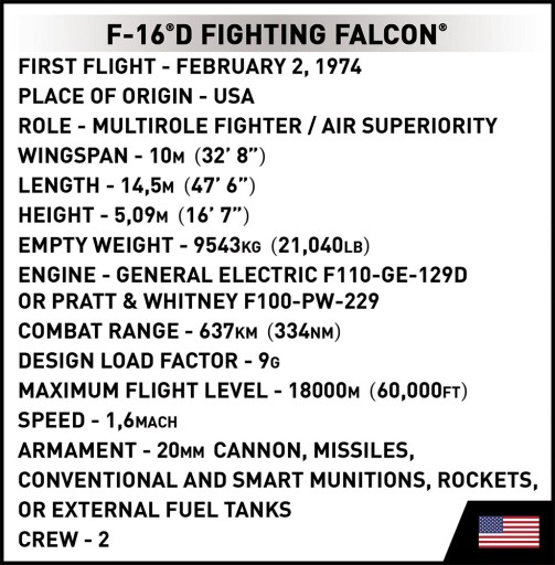 Z 410 najwyższej jakości klocków konstrukcyjnych COBI wybudujesz wydany na licencji megakoncernu zbrojeniowego Lockheed Martin najpopularniejszy na świecie samolot szkolno-bojowy F-16®D FIGHTING FALCON®. Zestaw został starannie zaprojektowany w modelarskiej skali 1:48. Klocki zostały pokryte wysokiej jakości nadrukami. Specjalnie zaprojektowana dwumiejscowa kabina mieści dwie pełnowymiarowe figurki pilotów! Kabina została wykonana w nowej technologii dwukolorowego wtrysku. To nowinka w technologii produkcji i nowa jakość COBI! Do zestawu dołączone są dwie figurki pilotów wyposażone w kaski i maski tlenowe z wężykiem. Całość zestawu uzupełnia klockowa podstawka ekspozycyjna z tabliczką zawierającą nazwę zestawu! Dzięki intuicyjnej instrukcji budowa jest prosta i nie sprawi problemów mniej zaawansowanym budowniczym. Zestaw spełni oczekiwania miłośników lotnictwa, militariów i klockowych pasjonatów. F-16 będzie się doskonale prezentował zarówno u dorosłego kolekcjonera, jak i w pokoju nastolatka. Buduj historię z COBI!
