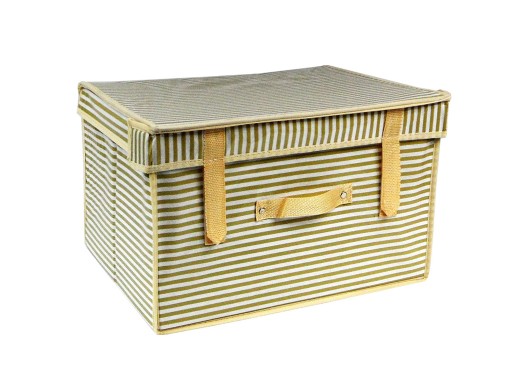 Przedmiotem tej aukcji jest mocny kufer tekstylny, rozmiar M, służący do przechowywania ubrań, pościeli, ręczników, butów, zabawek, książek itp. To praktyczne pudło wykonane jest ze sztywnej tektury, obszytej mocnym materiałem ceratowym odpornym na przetarcia i zabrudzenia, przez co może być przetrzymywane zarówno w sypialni, garderobie jak i piwnicy czy garażu.