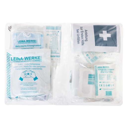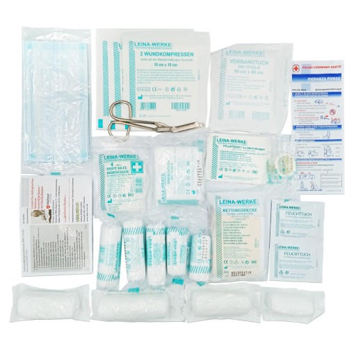 ✅ Wyposażenie apteczki pierwszej pomocy spełniające wymagania Unii Europejskiej oraz normy DIN 13157.