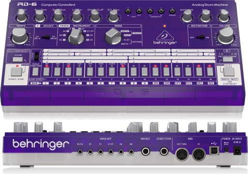 Behringer RD-6-GP klasyczny analogowy automat perkusyjny z 8 brzmieniami perkusyjnymi, 16-to krokowym sekwencerem i efektem distortion, kolor: fioletowy